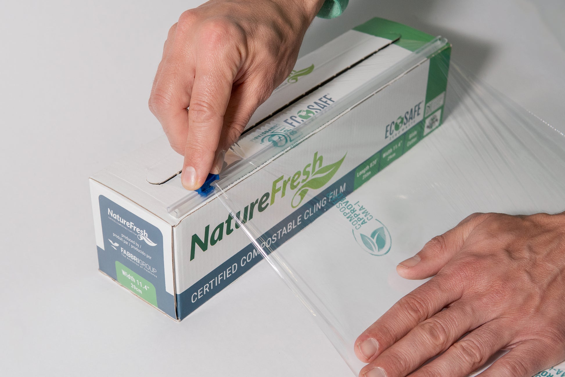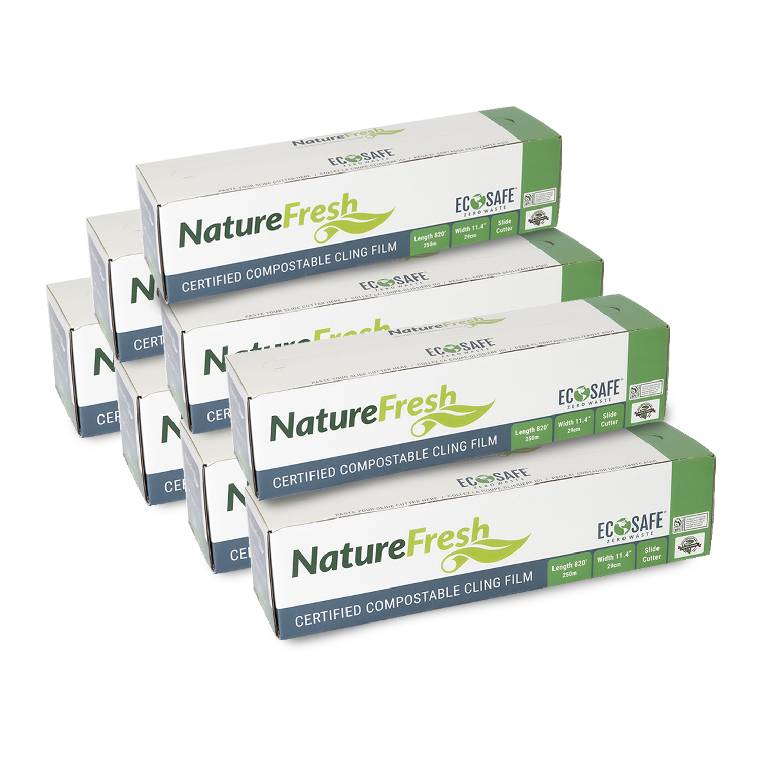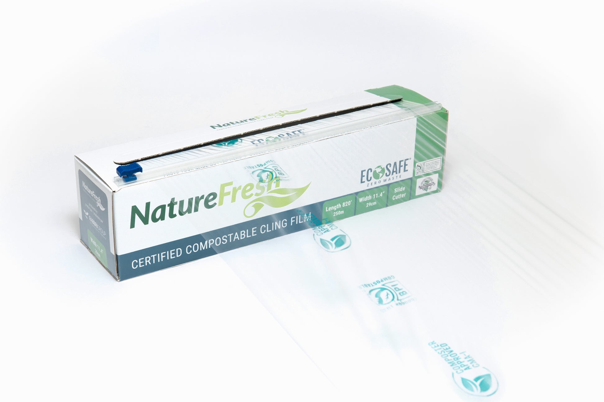 EcoSafe®’s Nature Fresh compostable cling film offers a durable, breathable solution for food packaging needs in grocery, deli, and foodservice settings. This smaller-width roll is ideal for wrapping produce, meats, and smaller trays—delivering anti-fog performance and extended shelf life while reducing plastic waste. Sold in cases of 8 rolls, it's a smart bulk option for high-use environments.