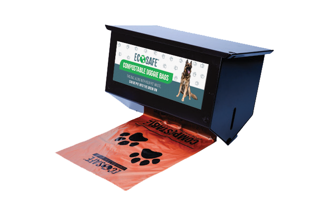 The EcoSafe® Compostable Doggie Bag Dispenser is designed for outdoor use in parks, walking paths, and other public spaces, providing dog walkers with convenient access to pet waste bags.