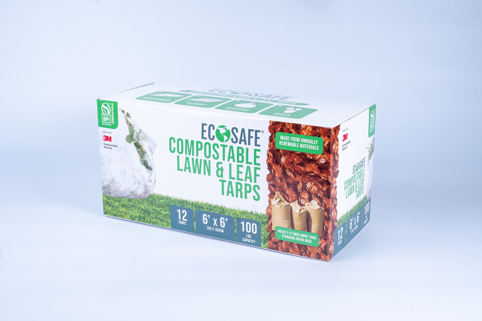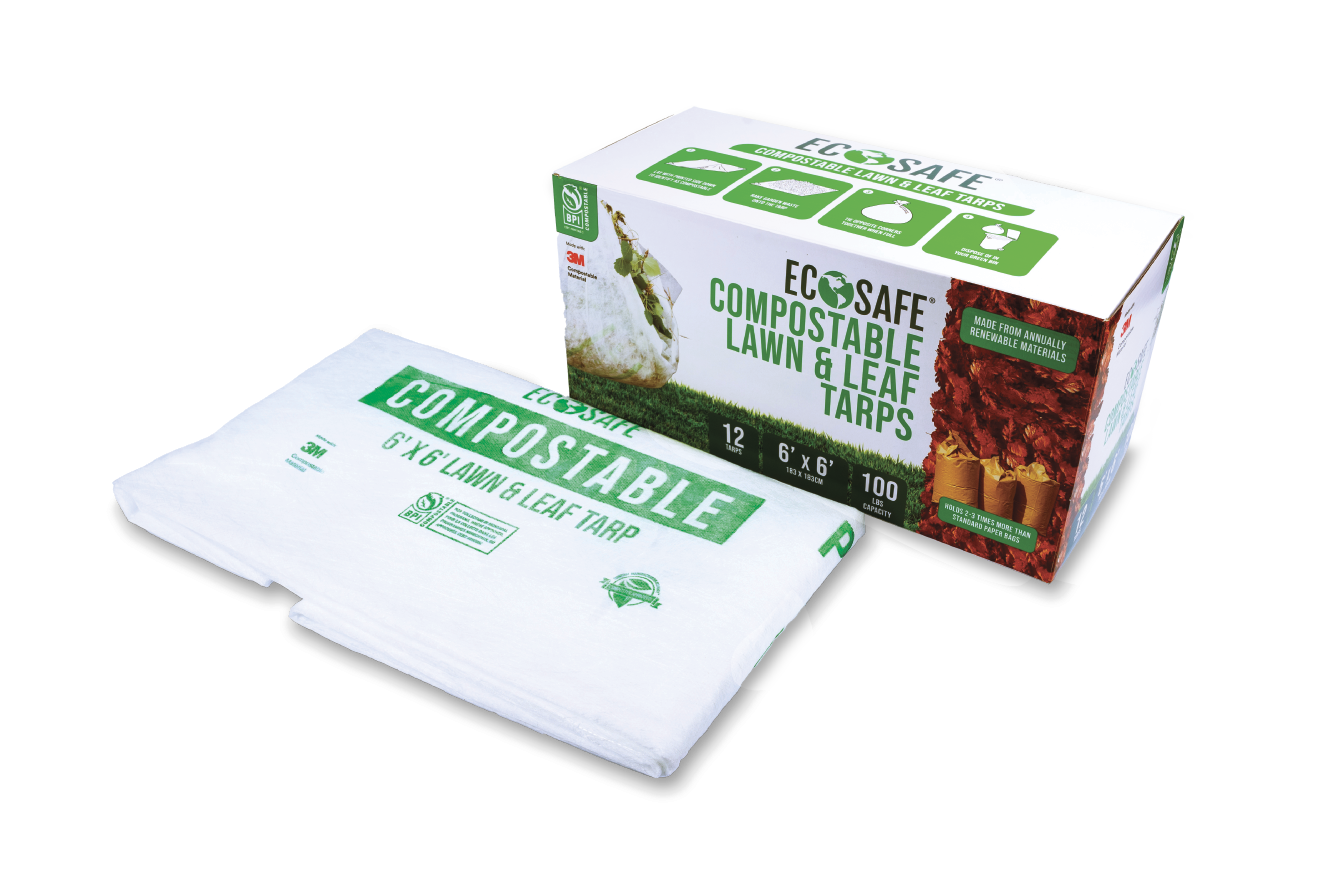 The EcoSafe® Compostable Lawn & Leaf Tarp is an efficient, eco-conscious solution for yard waste collection. Measuring 6′ × 6′, this durable, compostable tarp is made from 100% plant-based, annually renewable materials—no trees required. It easily holds over 50 lbs of leaves, grass clippings, and garden debris, offering 2–3x the capacity of a traditional kraft yard bag. This tarp is tough enough to be reused multiple times for seasonal cleanups. When it reaches the end of its life, simply place it in your commercial compost bin.